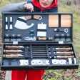 Шампури (6 шт.) – виготовлені з високоякісної нержавіючої сталі, яка гарантує довговічність і стійкість до корозії. Загальна довжина кожного шампура – 63 см, товщина леза – 3 мм. Ці параметри забезпечують міцність і зручність при нанизуванні м’яса, овочів чи інших продуктів. Виделка для зняття м’яса (1 шт.) – практичний інструмент, який дозволяє легко та безпечно знімати готові шматочки шашлику з шампурів. Автоматична шашличниця на 6 шампурів (1 шт.) – виготовлена з нержавіючої сталі, вона забезпечує постійне обертання шампурів над вогнем, рівномірне просмаження м'яса без зайвих зусиль. Power Bank на 5000 mAh (1 шт.) – компактний і зручний, він знадобиться для підключення автоматичної шашличниці та стане в пригоді для підзарядки гаджетів під час відпочинку на природі. Ніж-сокирка (1 шт.) – універсальний інструмент для нарізання продуктів або виконання інших завдань на пікніку. Дощечка (1 шт.) – компактна дерев’яна дошка для нарізання інгредієнтів або подачі страв. Скляні чарки (6 шт.) – елегантні та міцні, вони ідеально підходять для тостів у компанії друзів. Фляга (1 шт.) – стильна та практична, підійде для зберігання й транспортування улюблених напоїв. Запальничка (1 шт.) – надійна та зручна, щоб швидко розпалити вогонь. Штопор-відкривачка (1 шт.) – універсальний інструмент для відкривання пляшок і консервів. Посуд для спецій (2 шт.) – компактні ємності для зручного зберігання та використання солі й перцю. Дерев’яна коробка – елегантна та міцна, виготовлена з екологічного матеріалу. Вона не лише надійно зберігає всі предмети, але й додає набору преміального вигляду.