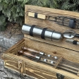 І що може бути краще, ніж набір, який також є витвором мистецтва? Кейс ручної роботи виготовлений з натурального дерева твердих порід, і тому є не тільки елегантним аксесуаром для зберігання та транспортування, але й додає нотку вишуканості та розкоші у вашій кухні або на пікніку.