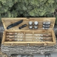 У комплект входить:Кейс з дерева 740х250х160 мм6 шампурів з дерев'яною ручкою 3*12*630 мм 4 чарки ФлягаМисливський ніж в чохліЛіхтарик